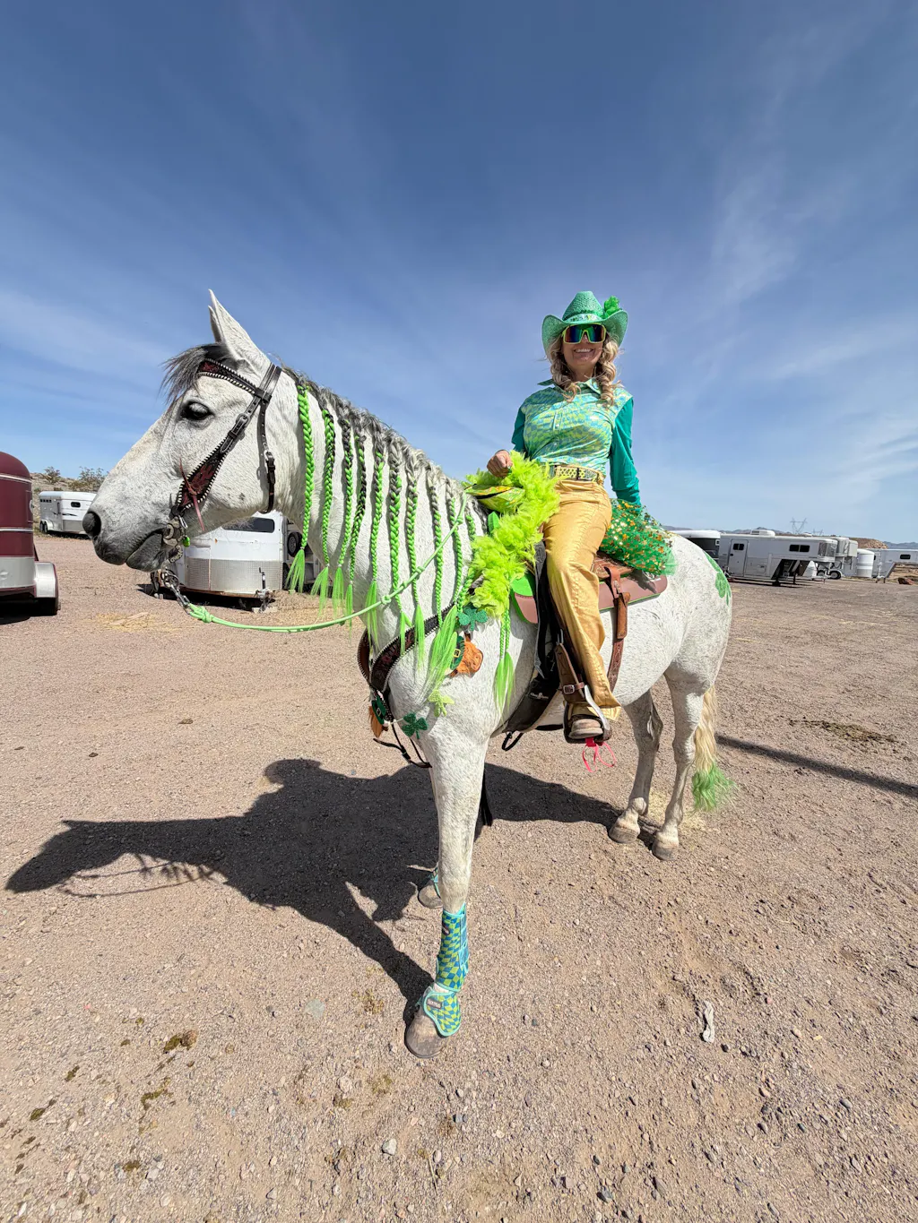 I really love RD jeans for the simple fact they wash so well and survive the dryer and maintain their shape. I also like how the size options give the girlies with the long dancers legs those options for the added length so the coverage is there while sitting in the saddle!! What I do if they drag a bit is just roll the bottom once or twice until I’m in the saddle and then adjust as needed! The zippers and buttons have all remained intact and sturdy with no issues! The material feels great to be in for the long show days and these particular pair I get complimented on a lot for the Color combo and design! Keep up the awesome job with these amazing clothing pieces!